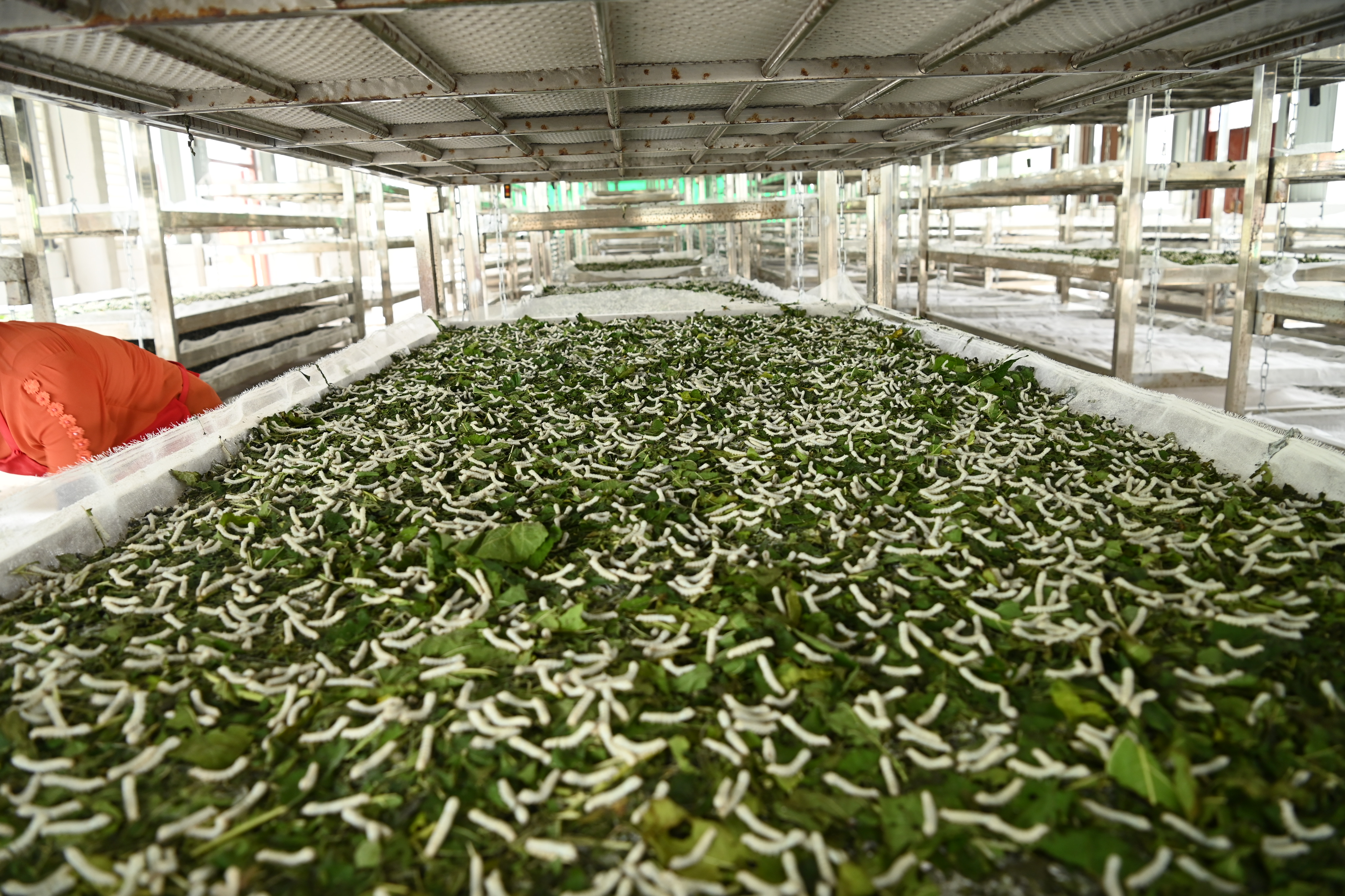 蚕房的饲养员,是年近60岁的赖惠君和朱雪琴,她们通过培训后走进了村集体经济建起的养蚕房,每天的工作就是给蚕儿当保姆,负责喂桑叶、洒石灰给蚕儿“洗澡”、打扫卫生、监控蚕房温度等,这样轻轻松松干一天工资是80元。“这把年纪了,在外打工没人要,但家门口打工就能挣钱。”赖惠君满意地说。